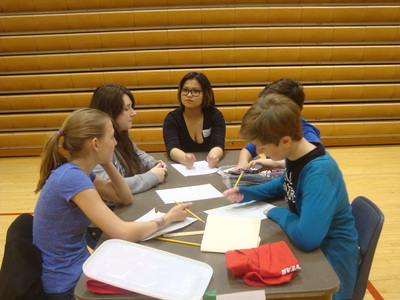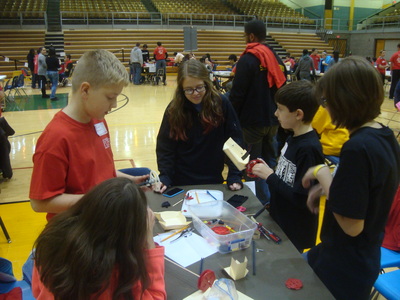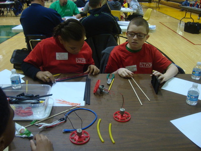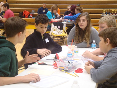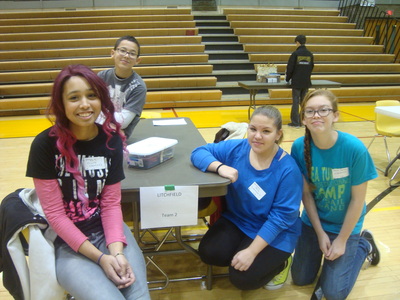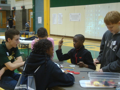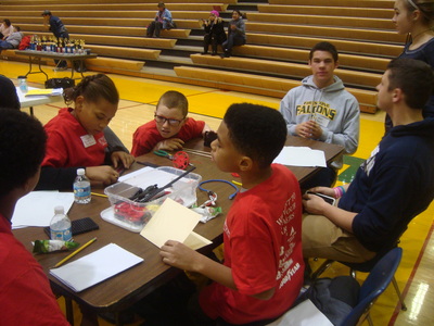 Students from Buchtel CLC, East CLC, Hyre CLC, Jennings CLC, Litchfield Middle School, Miller South School-VPA, NIHF STEM Middle School and Roswell Kent Middle School came pouring in early Saturday morning, were quickly registered and seated at their team's table. Upon sitting down, the were introduced to the Project Lead the Way student assigned to their group, to act as mentor and guide as they went about fulfilling the challenge.