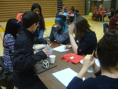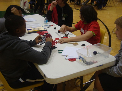 Each team of 2-6 students received a box of parts, including things like wooden axles, different sized plastic wheels, rubber bands, three default direct drive motors, an assortment of gears, plastic tubing, plastic base plates, screws and nuts, and an adapter cord that would hook the motors up to our control boxes. Given a copy of the design process, paper to brainstorm and a schedule, they were off.